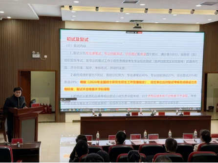 本网讯(文/斯琴塔娜 刘永晓 图/李莹)为做好2026届毕业生考研报名指导,帮助学生明确考研目标、合理规划备考路径,康复医学院于2025年10月9日在东明校区举行2026届毕业生考研指导会议。康复医学院院长冯晓东,党委副书记李伟峰,副院长许国防、刘斌,研究生院招生办主任何林青,康复医学院学工办主任高宇,毕业班辅导员斯琴塔娜、全体考研指导小组教师以及2026届全体毕业生参加会议。会议由学工办副主任杨富斌主持。